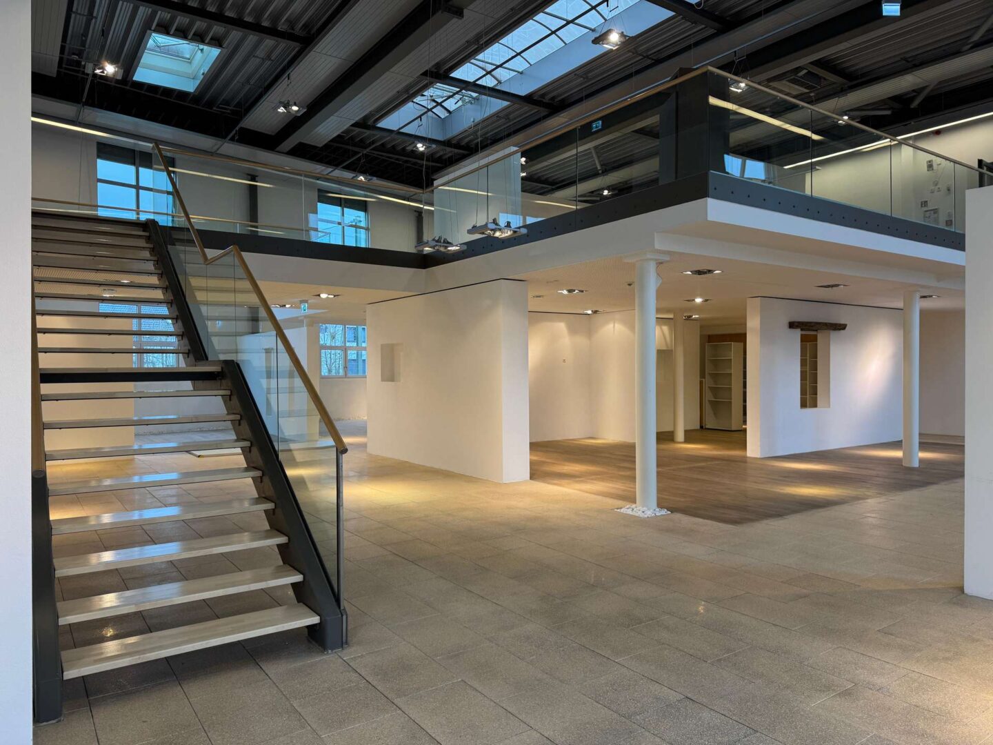 Die Fläche erstreckt sich über zwei helle und freundliche Geschosse, die durch interne Treppen verbunden sind. Großzügige Fensterfronten sowie zusätzliche Dachfenster sorgen für reichlich Tageslicht und schaffen eine angenehme, einladende Arbeitsatmosphäre für Mitarbeitende und Kunden.